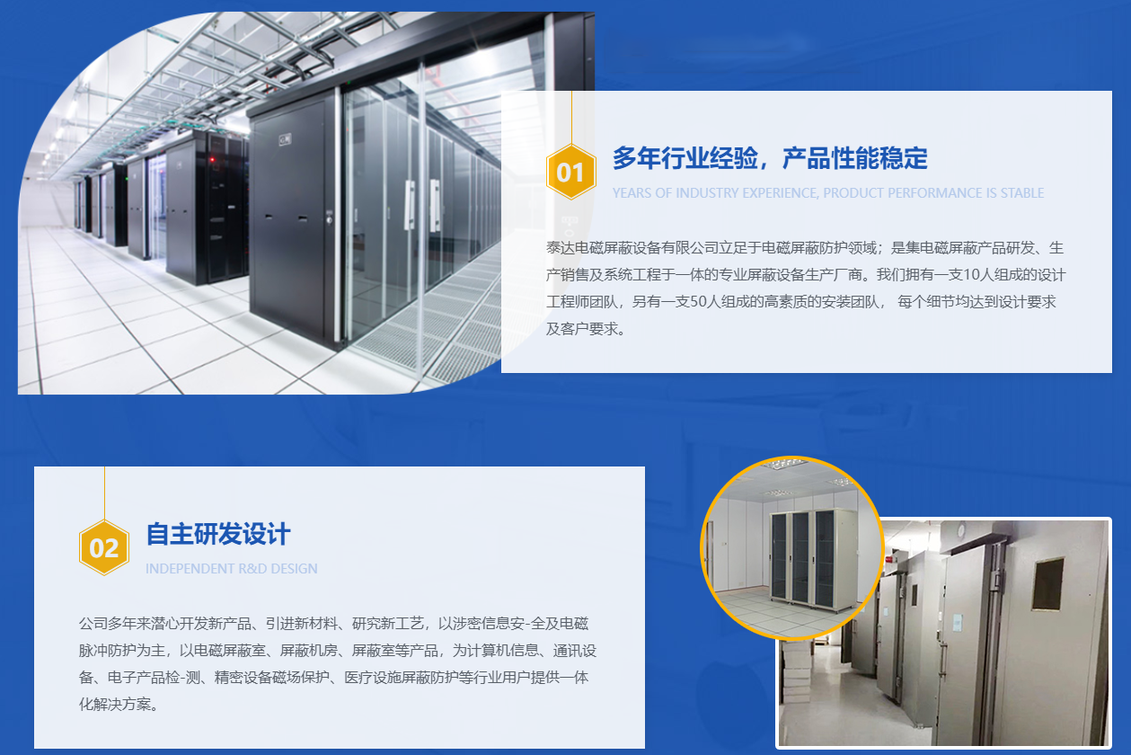 南陽市泰達電磁屏蔽設備有限公司一家專業從事高性能電磁屏蔽室、屏蔽機房、屏蔽室、電磁屏蔽機房、屏蔽門等設備的開發、生產、安裝的專業企業。目前我公司以擁有國內較好的電磁兼容科研人員和高素質的現場安裝力量,我公司有員工20余名包括技術、設計3名,我們的屏蔽機房已得到用戶好評。公司生產的屏蔽機房及屏蔽設備效能穩定,使用方便,美觀大方,并能有效抑制工業和空間電磁場對室內電子設備的干擾,防止機密電磁信息的泄露,它廣泛應用于電子通訊、產品的生產調試、故障搶修、計量電磁、兼容測試,計算機、醫療設備、人防…